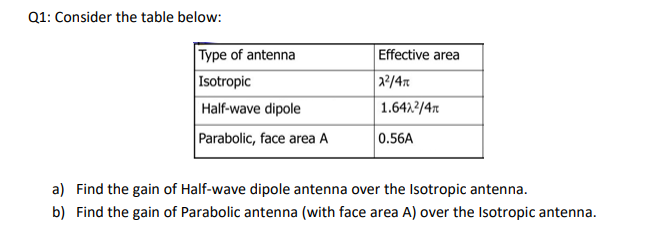 Solved: Q1: Consider The Table Below: Type Of Antenna Isot... | Chegg.com